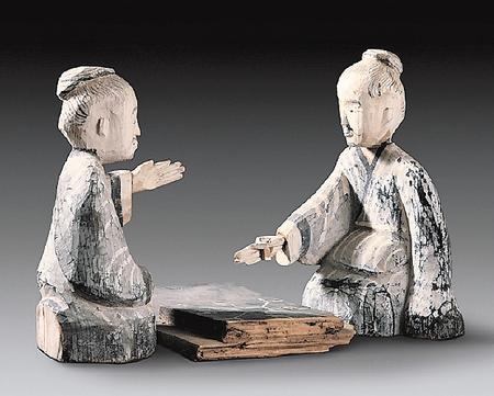 出土于西漢晚期48號(hào)墓的六博俑,包括一件棋盤、兩件俑。棋盤長(zhǎng)29.2厘米,寬19.3厘米,呈長(zhǎng)方形,黑色涂底,上面繪有白色“規(guī)矩紋”圖案,好似棋格;木俑高28.5厘米,為兩位跪坐相向?qū)牡睦夏昴行?。身著右衽長(zhǎng)袍,梳圓髻,留胡須,全身以黑白為主色。