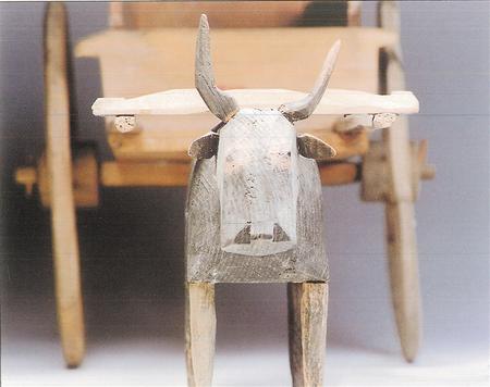 木牛俑高度約20厘米左右,通常先雕出輪廓,然后通體飾黑彩,白彩勾眼和絡(luò)頭等。從造型來(lái)看,木牛目視前方,屈背,四足蹬地,身軀健壯有力。拉著牛車或拉木犁的牛俑一般繪有絡(luò)頭,表現(xiàn)了田間勞作的情景。到西漢時(shí)期,隨著“軍事屯田”與“徙民實(shí)邊”政策的推行,牛耕技術(shù)在甘肅河西地區(qū)逐漸普及開來(lái)。