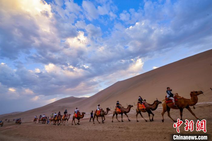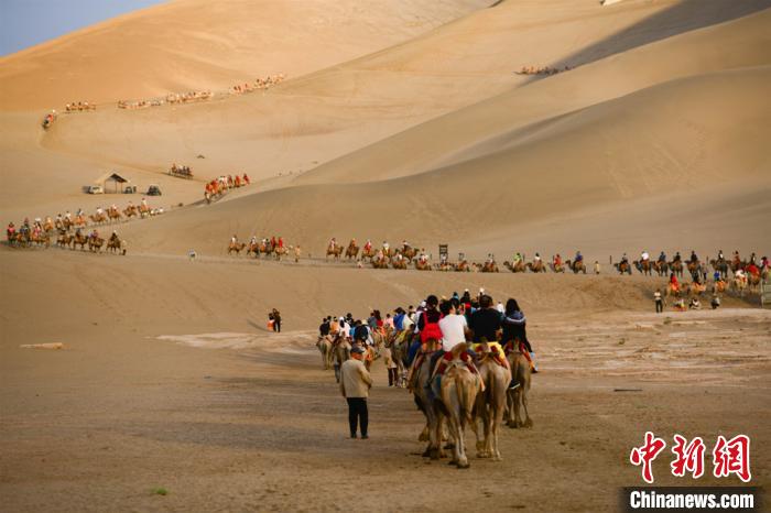 圖為游客騎駱駝暢游鳴沙山。 王斌銀 攝
