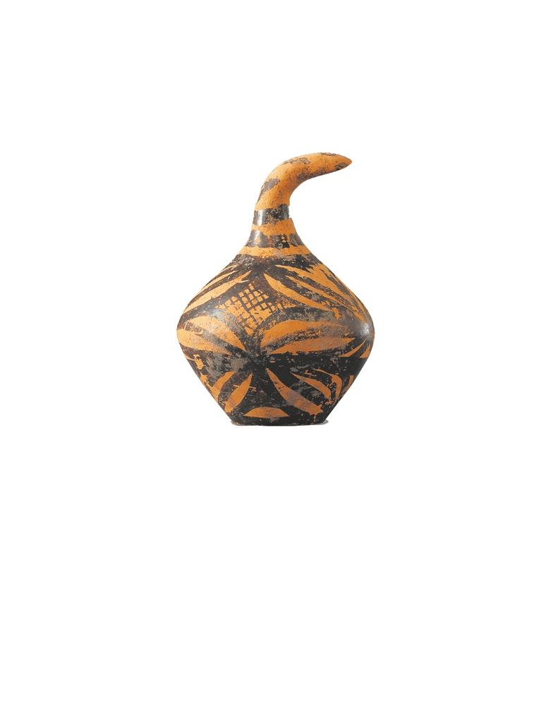 菱形網(wǎng)紋曲柄彩陶鈴 馬家窯文化馬家窯類型(距今約4800年),廣河縣祁家集出土。這件陶器看起來很奇特吧,若不是器身略鼓的腹部,幾乎就是歪嘴葫蘆的形狀。這件陶器腹部是中空的,里面裝著些小陶丸或小石子,搖晃起來沙沙作響。這件彩陶是干什么用的呢?其性能類似現(xiàn)在給幼兒玩的鈴鐺,它應(yīng)該是原始的樂器。