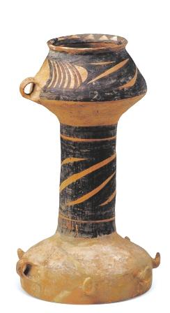 弦紋彩陶鼓 馬家窯文化馬家窯類型(距今約4800年),永登縣出土。這是一只陶鼓,鼓的兩端各有一耳,用于系繩,一端為喇叭口,另一端為罐形口,喇叭口外有六個(gè)爪突,用于固定鼓面。想必是用緊繃的獸皮做鼓面,這應(yīng)是腰鼓的雛形,是迄今為止發(fā)現(xiàn)時(shí)代最早的打擊樂器。