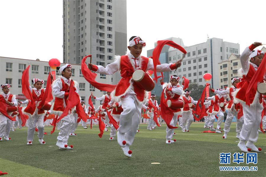 11月4日,蘭州市桃樹坪小學(xué)學(xué)生在活動(dòng)現(xiàn)場表演歡慶腰鼓。當(dāng)日,甘肅省蘭州市城關(guān)區(qū)學(xué)校體育“一校一品”現(xiàn)場展示活動(dòng)在蘭州市第五十四中學(xué)舉行,16所學(xué)校進(jìn)行了特色校園體育項(xiàng)目表演。據(jù)介紹,蘭州市城關(guān)區(qū)現(xiàn)已推廣各類體育項(xiàng)目40余項(xiàng),命名“體育特色項(xiàng)目示范校”42所。 新華社記者 張智敏 攝