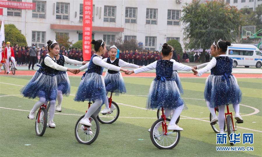 11月4日,蘭州市伏龍坪小學(xué)學(xué)生在活動(dòng)現(xiàn)場進(jìn)行獨(dú)輪車表演。新華社記者 張智敏 攝