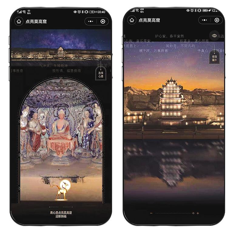 為了感受千年前莫高窟的燃燈民俗,記者迫不及待地體驗了一把:進(jìn)入“云游敦煌”官方小程序,通過“點亮莫高窟”入口,即可欣賞星空下的莫高窟全景,并與萬千用戶一起“點亮”崖體上的洞窟。隨著用戶點亮人次增多,畫面中燈光的亮度也隨之增加。至深夜時分,用戶將會看到莫高窟崖體上空“銀河”與洞窟光亮相映成輝的景象,體驗千年前莫高窟燃燈盛況。“點亮莫高窟”的創(chuàng)意來自于敦煌文獻(xiàn)中記載的場景,莫高窟燃燈是敦煌歲時民俗。據(jù)記載,每逢特定的時間,當(dāng)?shù)孛癖姇谀呖吲e行盛大的燃燈活動,于窟龕點亮燈盞??偀魯?shù)可高達(dá)700余盞。