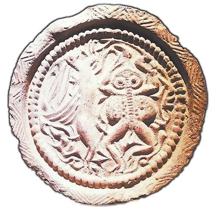 陜西淳化縣博物館收藏著一枚蟾蜍玉兔紋瓦當。這枚蟾蜍玉兔紋瓦當是國家一級文物,出土于咸陽市淳化縣西漢甘泉宮遺址。瓦當面分上、下兩部分,上半部浮雕的是一只疾奔的小兔,兩前足躍起,雙耳后豎,尾巴上翹;下半部是一只起跳的蟾蜍,圓目突起,大腹鼓圓,舌長伸。瓦當造型生動傳神,極富生活情趣。在我國古代神話傳說中,蟾蜍、玉兔是月宮里的動物,這個構(gòu)圖無疑是取自嫦娥奔月的神話故事。