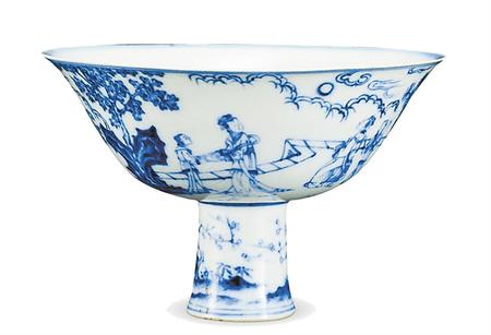 我國自古就有賞月祭月的習俗,這一習俗在文物里也有體現(xiàn),湖北省博物館收藏了一件青花瑤臺賞月圖瓷鍾。瓷鍾通高10.1厘米,口徑15.5厘米,足高4.6厘米,足徑4.2厘米,屬官窯出品,白胎,胎質(zhì)細膩,器壁光亮胎薄,叩之其聲如磬。瓷鍾上繪有“瑤臺賞月圖”,三組人物故事現(xiàn)于瓷鍾外壁:第一組有一老婦人側(cè)身坐在石墩上,身后站一侍女,雙手持扇,老婦對面站一年輕女子,其右側(cè)立一童子。第二組和第三組各有一青年女子和丫環(huán),畫面還有遠山、祥云和花草。“瑤臺賞月圖”紋飾在瓷器界又被稱為“人物紋”,較為罕見,圖中人物共賞天上一輪圓月,與宋人所繪《瑤臺步月圖》一脈相承,意境優(yōu)美,風格清新動人。