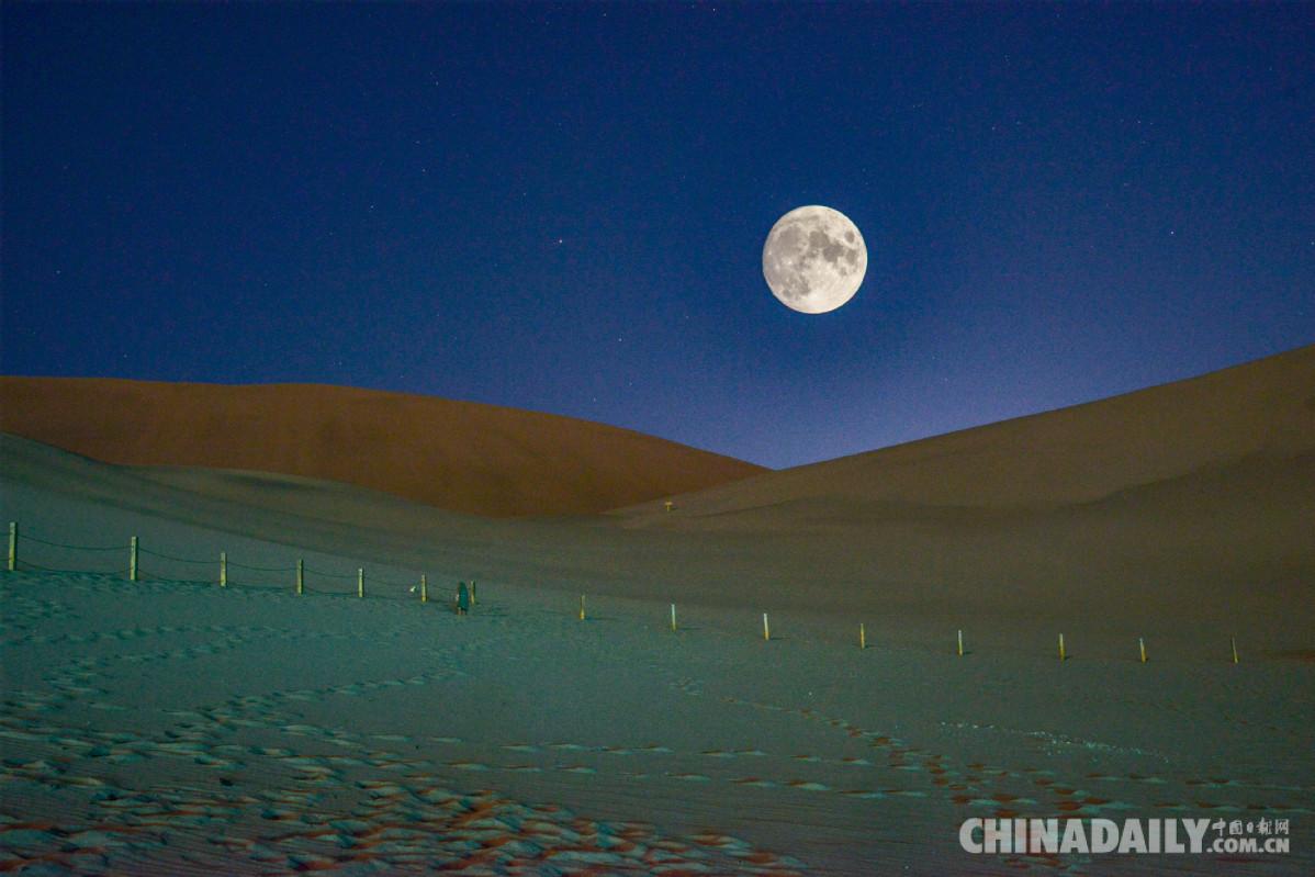 9月21日夜晚,一輪明月升起在大漠敦煌的上空,在中國(guó)傳統(tǒng)的中秋節(jié),甘肅敦煌月牙泉小鎮(zhèn)中心廣場(chǎng)舉辦了中秋拜月等民俗活動(dòng)。先舉行了仿古“拜月大典”。伴隨著深沉悠揚(yáng)的樂曲,身穿華麗漢服的參祭女子手捧月餅及各式貢品緩步登臺(tái),在皓月銀輝中虔誠(chéng)致祭;按照敦煌習(xí)俗,主祭三上香、三祭酒,并于月光與燭光映照之中,向月誦祝。按照傳統(tǒng)儀式祭拜禮成后,主祭將月餅與水果分發(fā)給現(xiàn)場(chǎng)拜月的市民游客,與大家共享中秋拜月祭品。隨后還進(jìn)行了中國(guó)傳統(tǒng)民族服裝——旗袍展示、漢服秀、歌舞演出等形式多樣的民俗活動(dòng)。當(dāng)日晚,小鎮(zhèn)人來(lái)人往非常熱鬧,眾多敦煌市民和游客參加拜月活動(dòng),受疫情影響,部分活動(dòng)在網(wǎng)上進(jìn)行,不少媒體人,對(duì)敦煌賞月、拜月活動(dòng)進(jìn)行了網(wǎng)絡(luò)直播。
