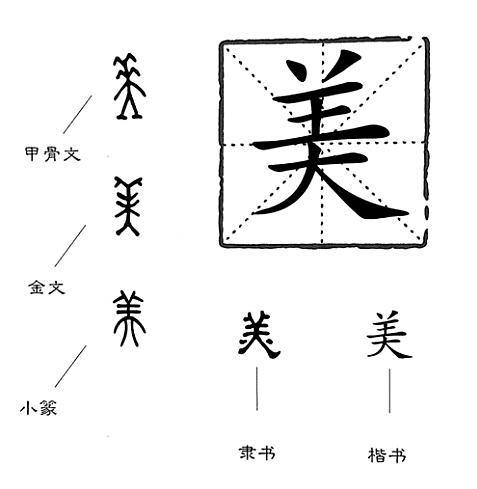 但是,從字源上看,“美”似乎不是一只羊,而是一個人。“美”初見于商代甲骨文,在甲骨文中,“美”不是會意字,而是象形字,它的古字形像一個戴著頭飾站得端端正正的人。一個人若頭上裝飾著高聳彎曲的羽毛或類似的頭飾物,是不是很美呢?本來遠古時的先民喜歡在頭上插上橫七豎八的頭飾,再聯(lián)想一下印第安酋長頭上那頂裝飾著長長羽毛的發(fā)冠,“美”的甲骨文字形簡直就是印第安酋長的簡筆畫。