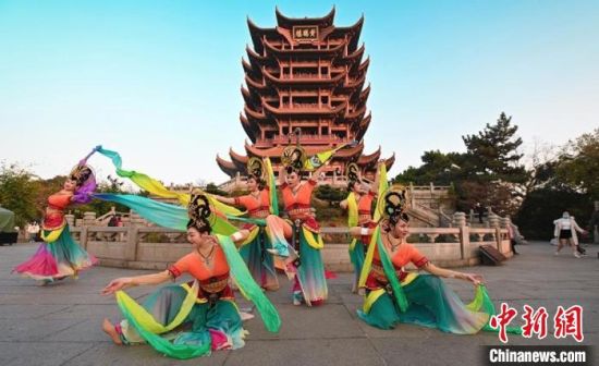 11月27日,伴著幽幽古樂,“飛天仙子”在“江南三大名樓”之一的黃鶴樓前演繹敦煌舞?!「拭C省文化和旅游廳供圖