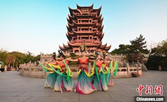 圖為“飛天仙子”在黃鶴樓前起舞?!「拭C省文化和旅游廳供圖
