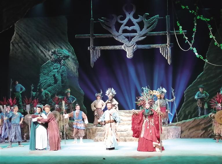 第三個(gè)步驟是大禹與土著山民首領(lǐng)山戎在強(qiáng)烈戲劇沖突中果斷地在改變自己的行為,并且以“忘我”的犧牲精神求得“天地之和,和在心中”的主旨意義。任何對(duì)自然生態(tài)的態(tài)度和沖突到頭來(lái)都集中體現(xiàn)在“人與人”的觀念習(xí)俗情仇恩怨的激烈紛爭(zhēng)之中。是故治水,也要“治理”自己的行為,升化自己的心智,以自己的真情坦露大愛(ài), 甚或犧牲自己的性命。這就是“戲”的魅力。