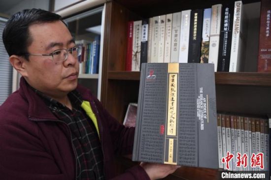 12月31日,甘肅教育出版社副社長白鑫展示近期出版發(fā)行的《甘肅藏敦煌遺書研究文獻引得》。 楊艷敏 攝
