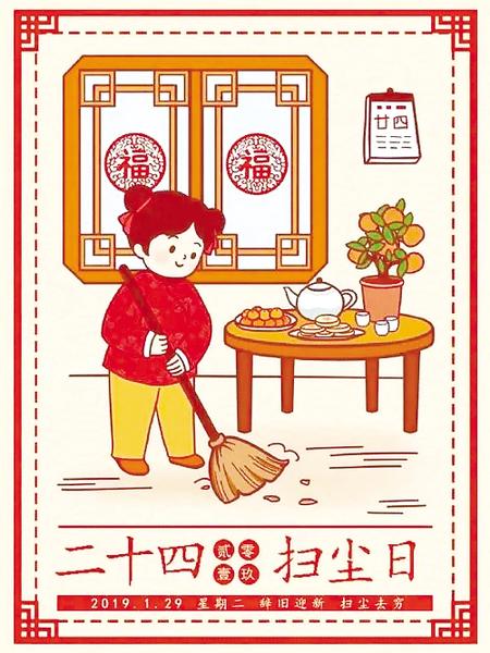 據(jù)《呂氏春秋》記載,這一風(fēng)俗源于堯舜時(shí)代。臘月二十四那天,隴上人家就陸續(xù)開(kāi)始打掃起來(lái),全家老少一起動(dòng)手,清掃房屋積塵,石灰刷墻,新紙裱糊仰塵,擦洗窗欞,糊上新窗紙,貼窗花或貼“窗孔子”(微型花鳥(niǎo)畫與書法),擦拭箱柜上的銅什件、器皿污垢,打氈抖土,拆洗被褥。一番流汗勞碌,居室煥然一新,過(guò)年的心情也更加舒暢。