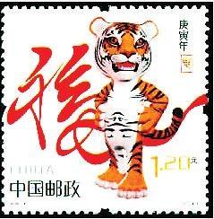 2010年1月5日發(fā)行第三輪生肖郵票第七套《庚寅年》特種郵票,全套1枚,由中央美術(shù)學院設(shè)計學院教授馬剛設(shè)計。設(shè)計者利用三維造型的特點采用擬人化的造型手法,勾勒出一只氣宇軒昂、活潑動人的卡通虎形象。
