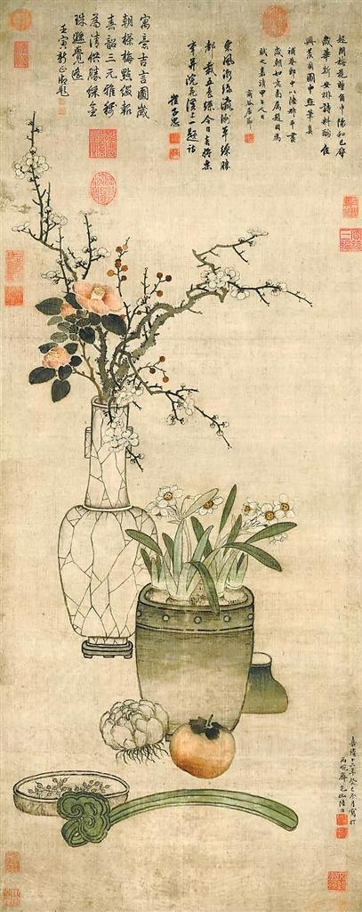 明代陸治的《歲朝圖》可以說是入門級別的標準范本。白釉冰裂紋貫耳瓶中插梅、茶、天竹,乳釘弦紋盆中植水仙。盆花前是百合、柿子、如意組成的百事如意組合,如意后方的盤中盛穗,又合作歲歲如意。