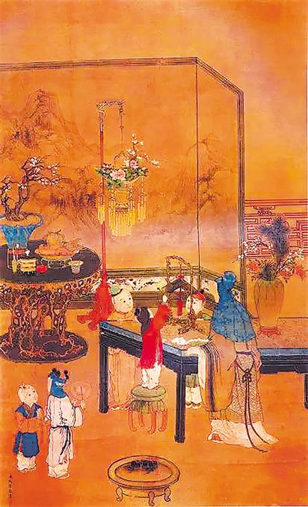 熟稔了這些歲朝清供的組合意象,就可以在單獨描摹景物之外,將其應用到各種其他年節(jié)繪畫中了。清宮流行的嬰戲圖里,歲朝清供就作為背景或具體的物件,融入畫中。