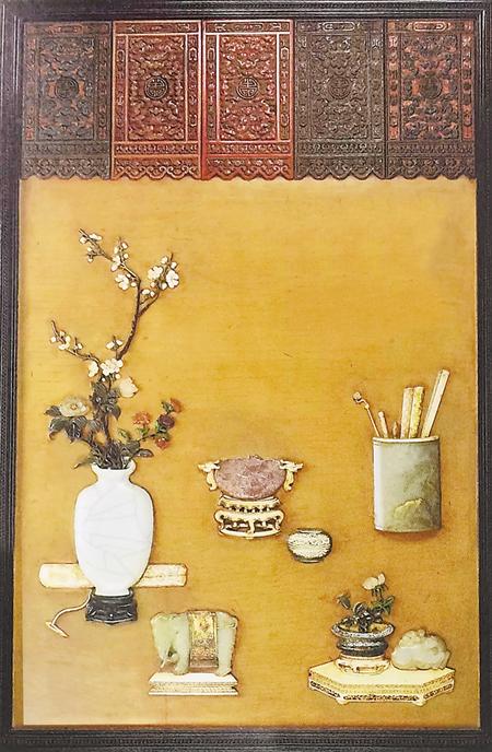 百寶嵌歲朝吉祥御制題詩掛屏,使用各種瓷、玉、寶石、金銀材料鑲嵌而成,也只有皇家才能制作。其中各部分零星擺放,相互之間無甚關聯(lián),已經出現(xiàn)歲朝圖圖案化的苗頭。在后來的發(fā)展中,歲朝清供圖演變成裝飾圖案,出現(xiàn)在服飾、建筑等藝術中。