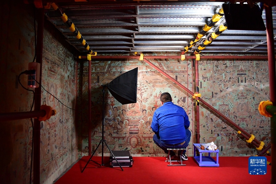 4月19日,王嬌在莫高窟第259窟做洞窟記錄。新華社記者 陳斌 攝