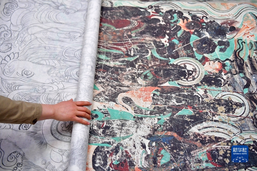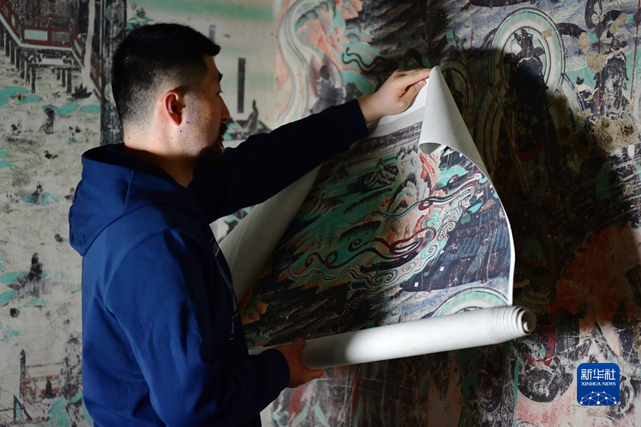 4月19日,在莫高窟第172窟,劉小同在對(duì)比臨摹壁畫的細(xì)節(jié)。新華社記者 杜哲宇 攝