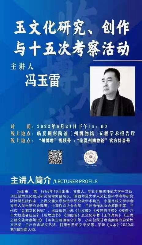 為認(rèn)真貫徹落實(shí)省第十四次黨代會(huì)精神,進(jìn)一步弘揚(yáng)中國(guó)玉文化和民族精神,推動(dòng)玉文化傳承及玉文化文創(chuàng)產(chǎn)業(yè)發(fā)展。6月21日下午,甘肅文化發(fā)展研究院常務(wù)副院長(zhǎng)馮玉雷受邀在臨夏州彩陶館(州博物館)學(xué)術(shù)報(bào)告廳作了題為《玉文化研究、創(chuàng)作與十五次考察活動(dòng)》的學(xué)術(shù)講座。