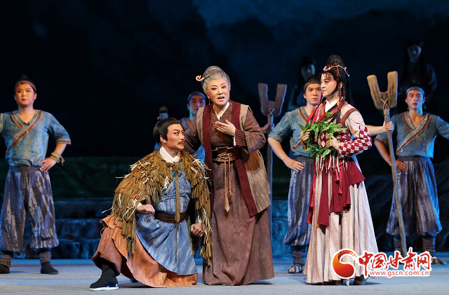 隴劇《大禹治水》是在甘肅省文化和旅游廳全程指導(dǎo)下,《黃河流域生態(tài)保護和高質(zhì)量發(fā)展規(guī)劃綱要》出臺之際,甘肅文藝工作者挖掘黃河文化蘊含的時代價值,講好“黃河故事”,實施隴原文藝高峰攀登工程、加強非物質(zhì)文化遺產(chǎn)保護傳承的具體行動。該劇將“大禹”這個上古英雄請下神壇,為他賦予了親情、愛情、家國情懷,在兩個小時的演出中,領(lǐng)銜出演“大禹”的優(yōu)秀青年演員邵炳德與雷通霞、竇鳳霞、佟紅梅等“三朵梅花”同臺飆戲,火花四濺的“開山”、扣人心弦“治水”,將大禹和先民們不畏艱險、篳路藍縷的開拓精神和奮斗精神,演繹得淋漓盡致,深深震撼著現(xiàn)場觀眾。而隴劇音樂獨有的“麻簧”、以皮影戲為表現(xiàn)手法的“月下婚禮”場景、水袖舞場景,把人物的情緒表現(xiàn)得栩栩如生,將獨具特色的隴劇藝術(shù)盡情綻放在舞臺之上。