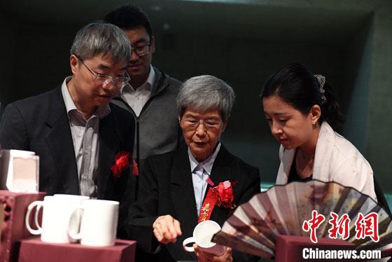2018年8月,樊錦詩(shī)(中)在莫高窟數(shù)字陳列中心參觀文創(chuàng)產(chǎn)品。(資料圖) 楊艷敏 攝