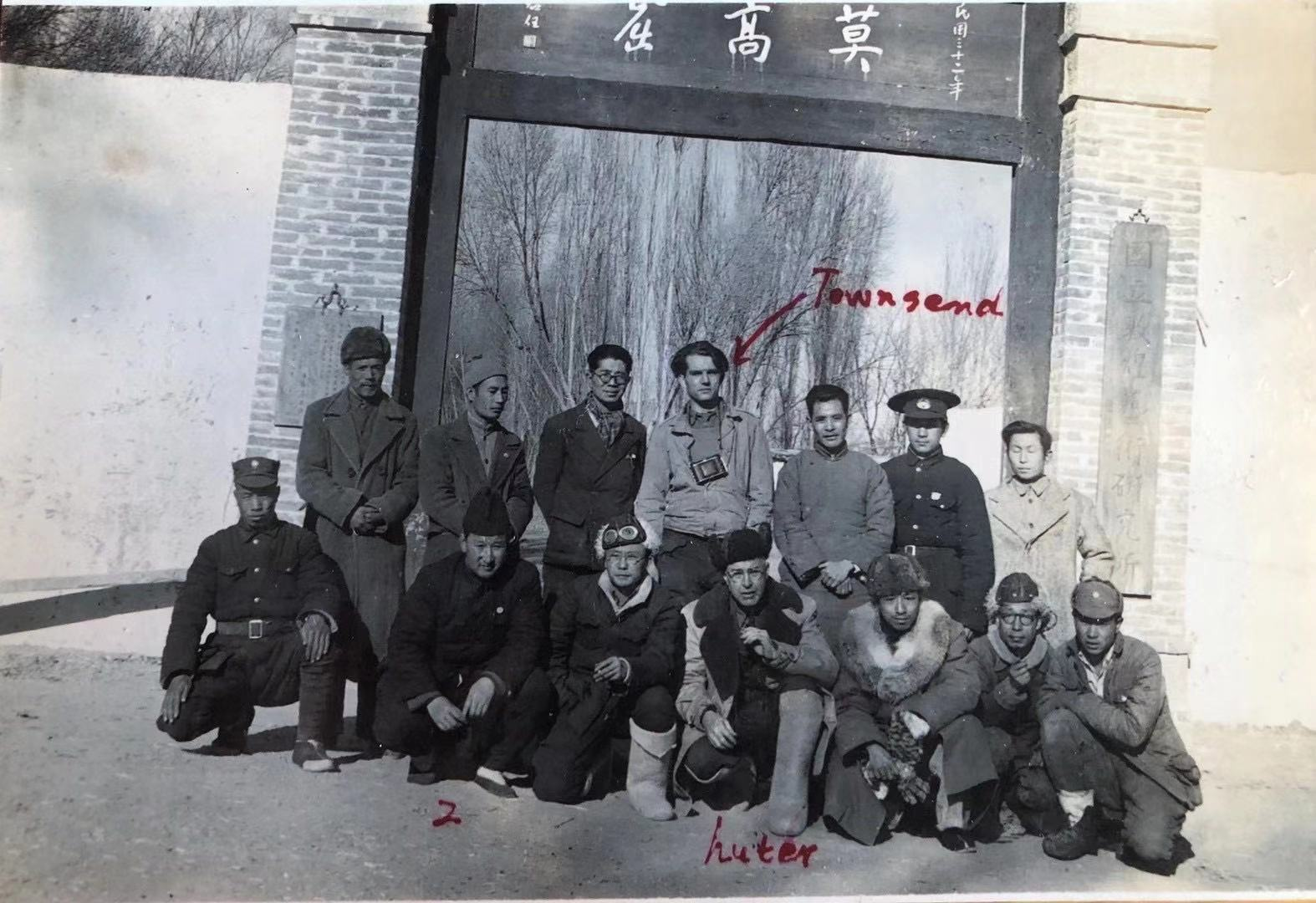 1945年4月張官廉(前排左三)陪同英國議員、英國消費合作社總社負責人胡特(后排中)考察山丹培黎學校期間在敦煌莫高窟前合影
