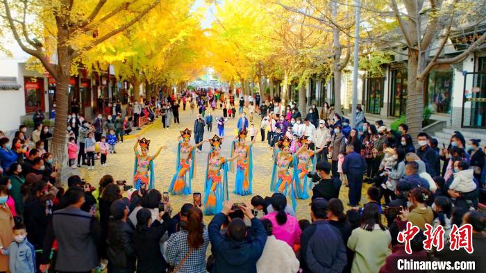 11月中下旬,在甘肅省天水市秦州區(qū)“黃金大道”上演了“絲路舞姿”,舞蹈是由秦州區(qū)文旅局組織的舞蹈隊帶來的舞蹈《絲路》《醉太平》和《萬疆》等。該路段由于216株銀杏樹的金黃色樹葉彼此參差相連,宛如兩條“黃金色帶”在道路兩側(cè),所以被當?shù)鼐用穹Q為“黃金大道”。