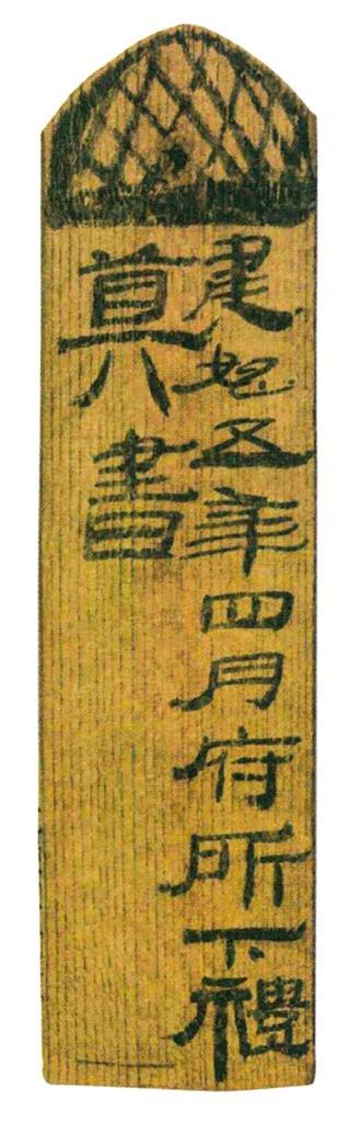 檢是傳遞文書(shū)、信札或財(cái)務(wù)時(shí)所用的封檢,分為兩種,一種是用兩行式的寬簡(jiǎn),題署收件人的姓名和傳遞方式。另一種是用于傳遞機(jī)密書(shū)信或財(cái)務(wù)時(shí)所用的加封泥蓋印章的封檢。機(jī)密書(shū)信用上下兩片木牘做成,下?tīng)┓Q(chēng)函,用于書(shū)信,上牘稱(chēng)檢,封蓋函牘。檢上有捆繩的刻溝和置封泥的方孔,以便繩封蓋印。傳遞財(cái)務(wù)的封檢只有一片木牘,中間凹下。