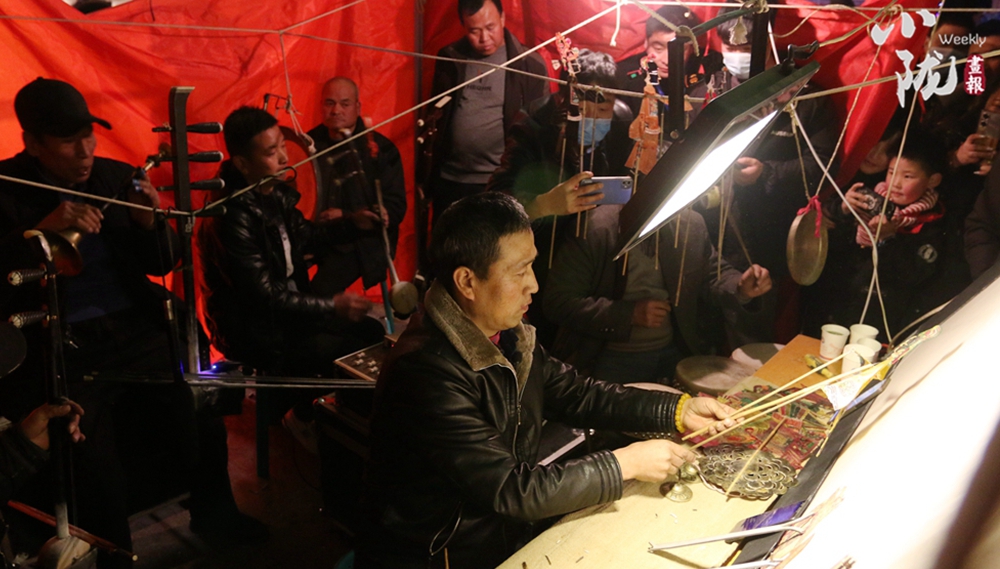 一張幕布、兩盞白熾燈、四五老藝人、七八件簡(jiǎn)單樂(lè)器,藝人在白色幕布后面,一邊用手操縱戲曲剪紙人物,一邊用本地流行曲調(diào)唱述故事,同時(shí)配以器樂(lè)以增加演戲氣氛。
