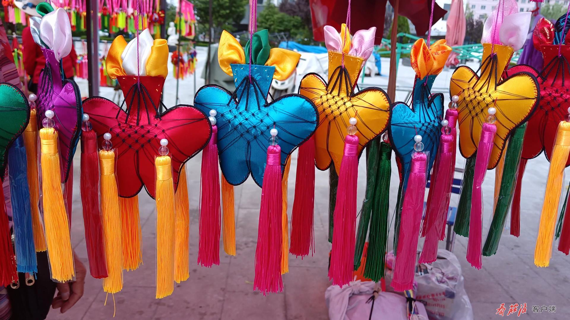 在眾多荷包中,馬尾荷包是荷包中的佼佼者,小巧精致,色彩鮮艷,既可以用來(lái)做裝飾品,也可作為禮物贈(zèng)送別人。馬尾荷包攤主大多是中老年婦女,也是馬尾荷包藝術(shù)的傳承者和守護(hù)者。馬彩玲就是其中之一,談起這種老手藝,老人充滿了喜悅。老人告訴我們,她十幾歲時(shí)就跟隨長(zhǎng)輩學(xué)習(xí)編荷包,如今已有四五十年的時(shí)間,比起賣荷包賺錢,更多的是她對(duì)馬尾荷包這種文化藝術(shù)的熱愛(ài)。馬彩玲說(shuō):“插楊柳、吃花饃饃,綁花線,戴荷包,一直是老傳統(tǒng),感覺(jué)非常的好,從小的時(shí)候就喜歡做這個(gè)東西,一直覺(jué)得丟不下,想把老傳統(tǒng)傳下去,每年都說(shuō)不做,但一到端午節(jié),就不由自己地開(kāi)始做起來(lái)了。”