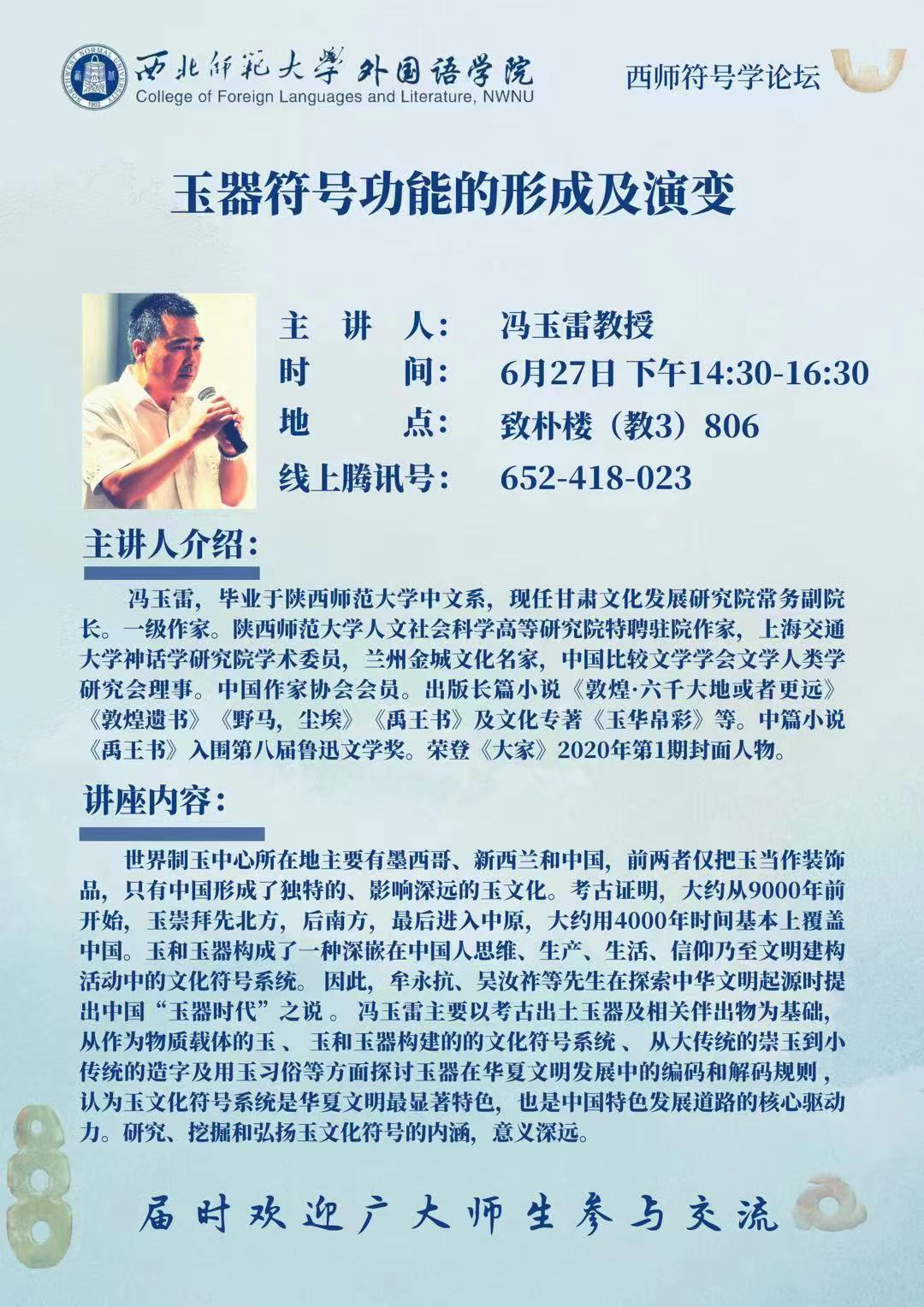 由甘肅文化發(fā)展研究院常務副院長、一級作家馮玉雷主講的《玉器符號功能的形成及演變》將于6月27日下午在西北師范大學舉辦。此項活動是西北師范大學外國語學院西師符號學論壇系列講座之一,旨在促進玉文化與符號學的融合研究。
