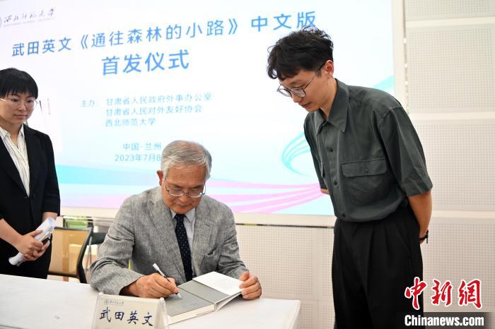 2023年7月8日,武田英文著作《通往森林的小路》中文版首發(fā)儀式在蘭州舉行。圖為武田英文給現(xiàn)場嘉賓簽名。 中新社記者 九美旦增 攝