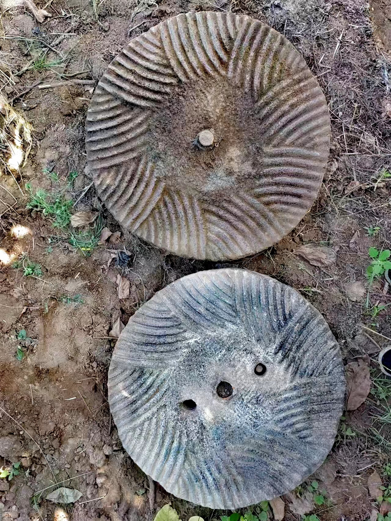 鑿石磨,其實也就是礪紋利齒。首先,將上扇抬起來放在地上鑿,下扇是固定在磨盤上面的,搬一條高凳子坐在上面鑿。上下兩扇的磨齒排列有序,互相對稱咬合,呈扇狀向四周延伸,極其科學合理。石匠就是把這些變鈍了的磨齒一錘一纖鑿鋒利。