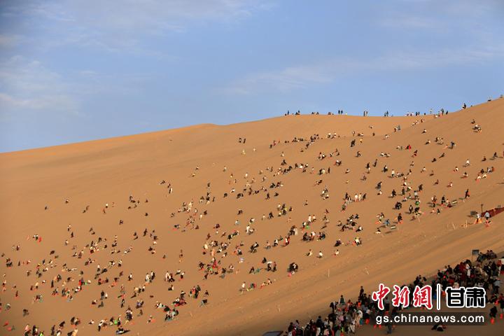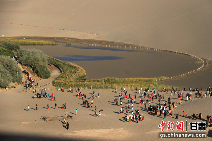 今年以來,甘肅省敦煌市旅游市場持續(xù)火熱。當(dāng)?shù)刂包c鳴沙山月牙泉在今年中秋國慶假期期間,累計接待游客首次突破300萬人次,比2019年同期增長35.5%,創(chuàng)歷史新高。(張曉亮 習(xí)剛)