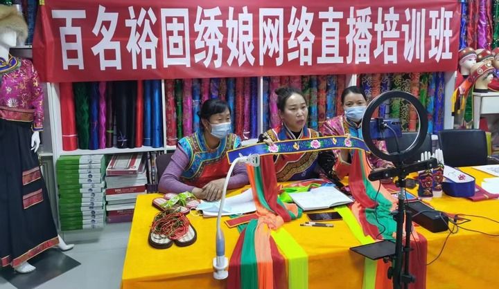 2021年11月,獲得甘肅省鄉(xiāng)村工匠名師稱號的潘小紅(中)帶領(lǐng)姐妹通過網(wǎng)絡(luò)直播幫助更多人學(xué)習(xí)刺繡技巧。新華社發(fā)(佘萬青攝)