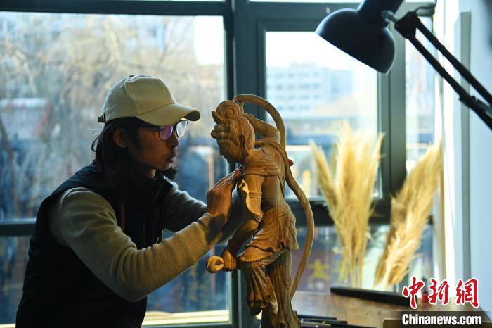 1月下旬,在甘肅蘭州技能人才服務產(chǎn)業(yè)園內(nèi),季茂杰進行敦煌元素的木雕創(chuàng)作。李亞龍 攝