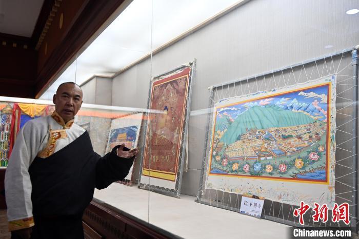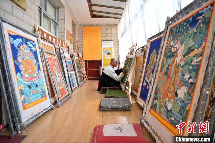 圖為交巴加布展示以拉卜楞寺為主題的唐卡作品。交巴加布不僅繼承了傳統(tǒng)唐卡技藝,更在創(chuàng)新中展現(xiàn)了個(gè)人特色。他結(jié)合現(xiàn)代審美和繪畫技巧,使作品既保留了傳統(tǒng)的韻味,又具有鮮明的現(xiàn)代氣息。這種獨(dú)特的藝術(shù)風(fēng)格使他的作品在眾多唐卡中脫穎而出,成為藏族民眾和藝術(shù)愛好者爭相收藏的藝術(shù)珍品。九美旦增 攝