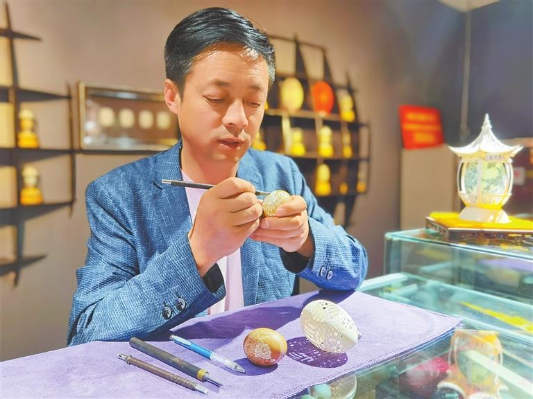 蛋雕改變了楊星國(guó)的生活,也改變了他對(duì)人生的追求。源于蛋雕藝術(shù)品呈現(xiàn)的精妙,慕名拜訪他的人很多,去他的工作室參觀或?qū)W習(xí),并向他請(qǐng)教問(wèn)題時(shí),他都會(huì)細(xì)致、耐心地講解或演示,有時(shí)候還會(huì)讓游客自己上手體驗(yàn)。