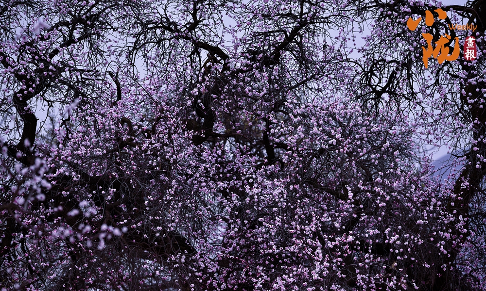 大面積杏樹應(yīng)季綻放,將一片片大地披上春天的“盛裝”,紫色的杏花,為大地寫滿了詩行,編織出一幅美麗的鄉(xiāng)村畫卷。