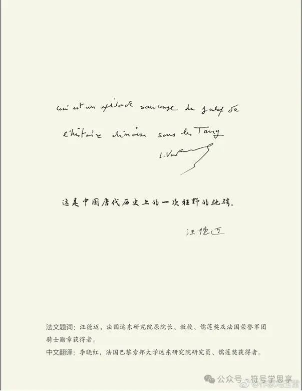 汪德邁先生對(duì)于馮玉雷這部作品給予高度評(píng)價(jià),2018年專門(mén)題辭:“這是中國(guó)唐代歷史上的一次狂野的馳騁。”馮教授專門(mén)把汪德邁先生給他的法文與中文題辭作為題簽印在書(shū)封面上,他多次跟我說(shuō):“幸遇汪德邁教授、李曉紅教授,受益良多,感激之情,難以言表。”