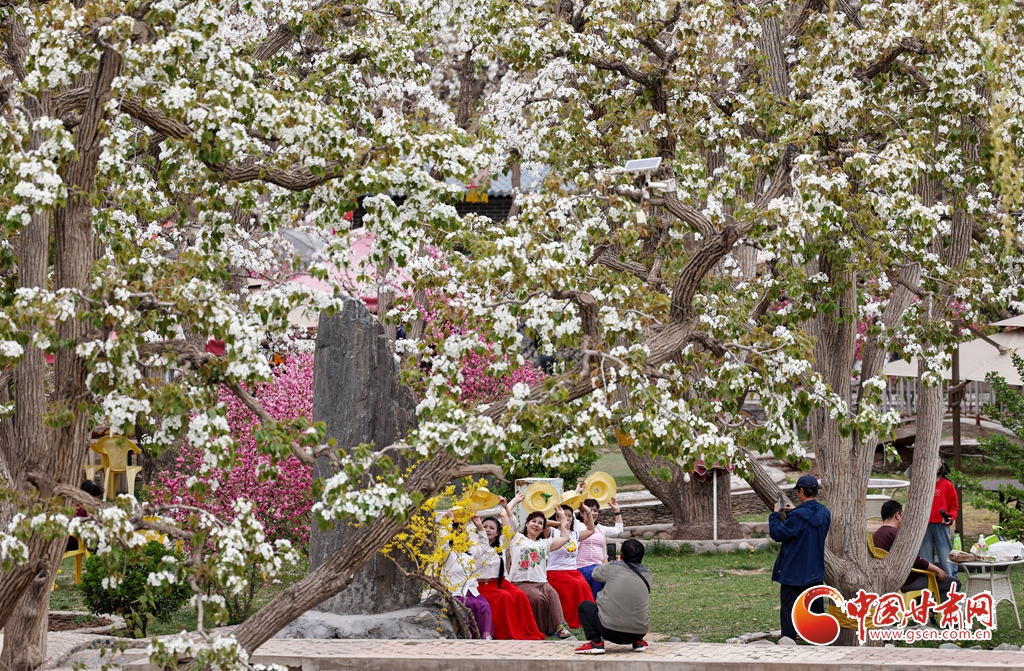 4月13日,位于甘肅省蘭州市皋蘭縣什川鎮(zhèn)的百年梨園綻放如雪,吸引眾多游客前來踏青賞花。