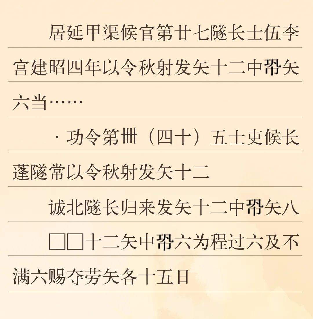 漢代對于官吏的考核分為文職和武職。文職主要考核書寫能力、治理能力、財(cái)務(wù)能力、法律能力等;武職考核主要是一年一度的射箭考核,因?yàn)樵谇锛九e行,故稱為“秋射”,發(fā)十二箭,中六箭為合格(即“中程”)。河西邊塞的官府通過秋射這一活動(dòng),借以考察和檢驗(yàn)邊塞吏員們的軍事技術(shù)水平,并以此作為賜勞和奪勞的依據(jù)。為了提高吏員們的射箭技術(shù),邊塞官府還派專人來管理訓(xùn)練吏卒。邊塞參加秋射的主要是烽燧的燧長、部塞的候長、候官的候等吏員。