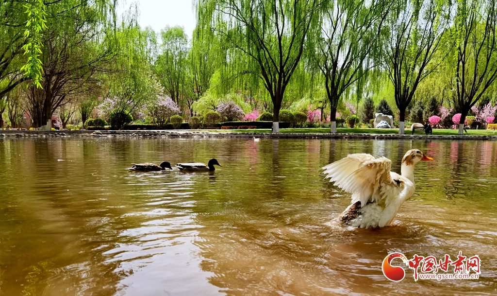 4月14日清晨,位于甘肅省張掖市河西學(xué)院的明理湖畔,春風(fēng)拂柳,鴨子嬉戲,空氣中不時(shí)飄來花香縷縷,到處一派春意盎然的美景。