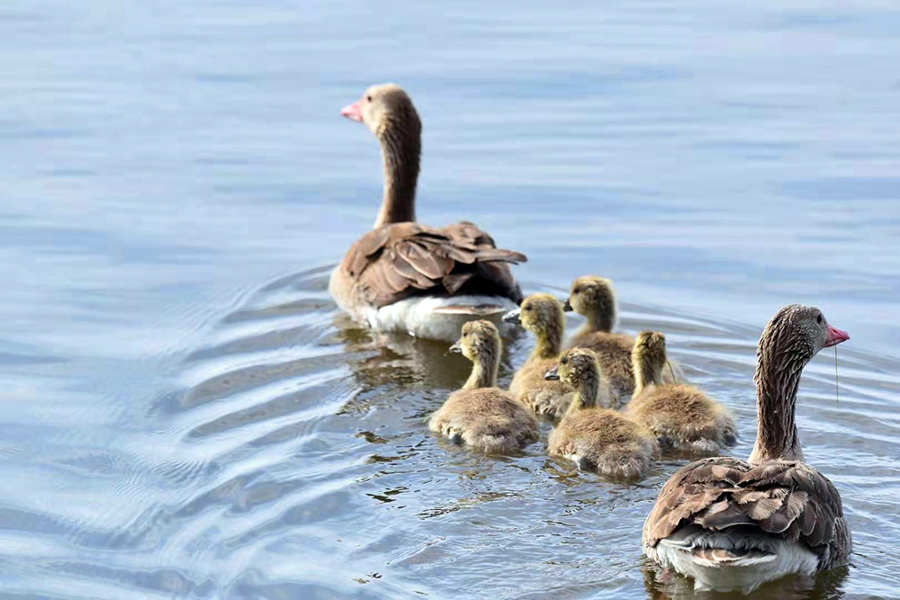 灰雁是鴨科雁屬鳥(niǎo)類,屬國(guó)家重點(diǎn)保護(hù)的“三有”鳥(niǎo)類,也是陽(yáng)關(guān)濕地的夏候鳥(niǎo)。監(jiān)測(cè)顯示,在陽(yáng)關(guān)濕地繁殖的灰雁家族有100多只。每年3月下旬遷飛至陽(yáng)關(guān)濕地,4月中旬筑巢繁殖,5月上旬孵化出雛鳥(niǎo)4至5只。灰雁為“一夫一妻”制,孵化由雌鳥(niǎo)單獨(dú)承擔(dān),雄鳥(niǎo)在巢附近負(fù)責(zé)警戒。待雛鳥(niǎo)破殼出窩后,則由雌雄共同撫育。灰雁生性膽小、機(jī)警,小寶寶溜達(dá)時(shí),雌鳥(niǎo)在前開(kāi)道,雄鳥(niǎo)負(fù)責(zé)斷后,小寶寶上岸覓食嫩草芽時(shí),雄鳥(niǎo)仍然負(fù)責(zé)警戒,若有危險(xiǎn)立刻鳴叫警示。故而,近距離拍攝灰雁雛鳥(niǎo)是比較困難的。