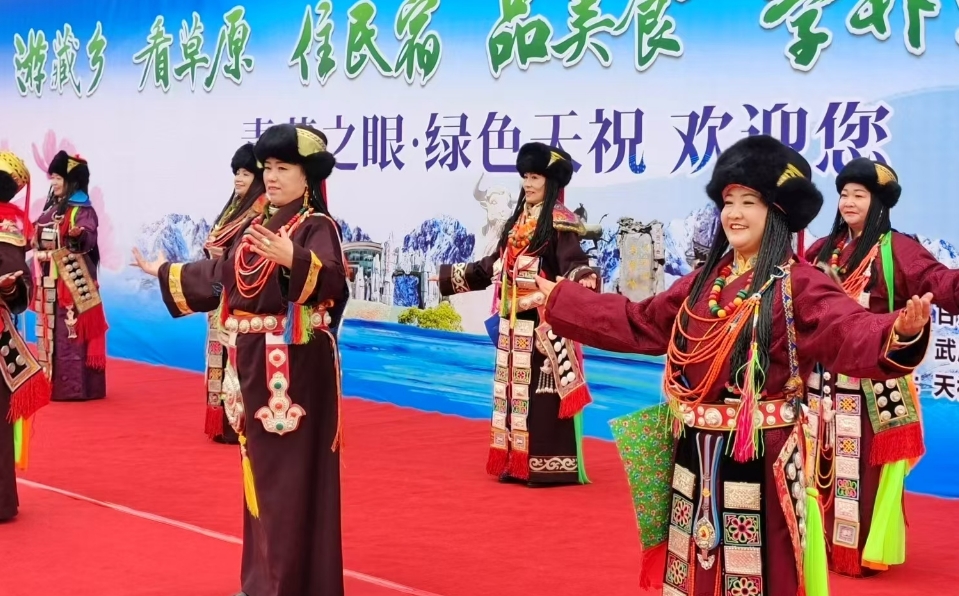 在天??h抓喜秀龍阿尼嘎卓帳篷城,身著藏族服飾的美麗卓瑪向采風(fēng)團(tuán)獻(xiàn)上了潔白的哈達(dá),華銳藏歌、華銳則柔、華銳鍋莊等獨(dú)具特色的文藝演出讓現(xiàn)場(chǎng)觀眾拍手稱贊。