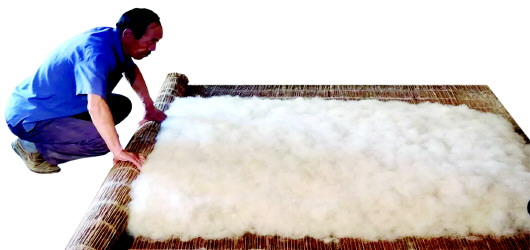 他一邊介紹一邊演示,先用白土揉進羊毛,吸掉油氣,再用彈弓加工松軟,并用手拍打鋪放均勻。搟氈前,還要撒面粉,通常中等大小的毛氈摻兩斤多面粉,以增加黏性和柔性。之后還要淋上開水,高溫瞬間會使羊毛變軟。