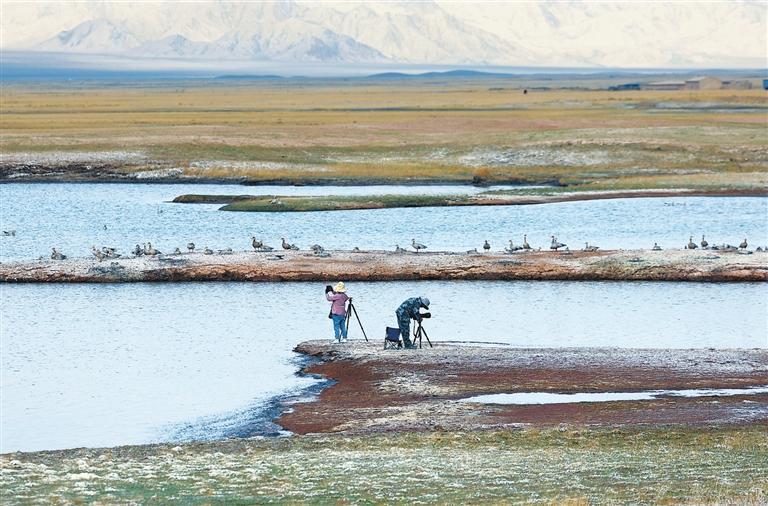 夏日的甘肅鹽池灣國家級自然保護區(qū)雪山巍峨,景色壯美。一群藏野驢時而追逐奔馳,時而悠閑覓食;大批北歸遷徙的候鳥自由翱翔,盡顯大自然的和諧之美。