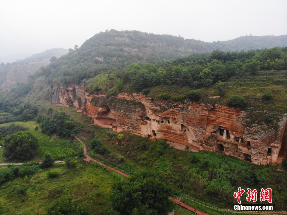 7月15日,航拍甘肅省平?jīng)鍪袥艽h百里石窟長廊中的羅漢洞石窟。百里石窟長廊位于涇川縣境內(nèi),由512個石窟、5眼窟中石井組成,現(xiàn)存王母宮石窟、鳳凰山石窟、南石窟寺、丈八寺石窟、羅漢洞石窟、太山寺石窟等規(guī)模較大的石窟群,還有數(shù)量眾多的小石窟群。羅漢洞石窟遺存40余個窟龕,以北魏至清代風格為主。(無人機照片) 中新社記者 李亞龍 攝