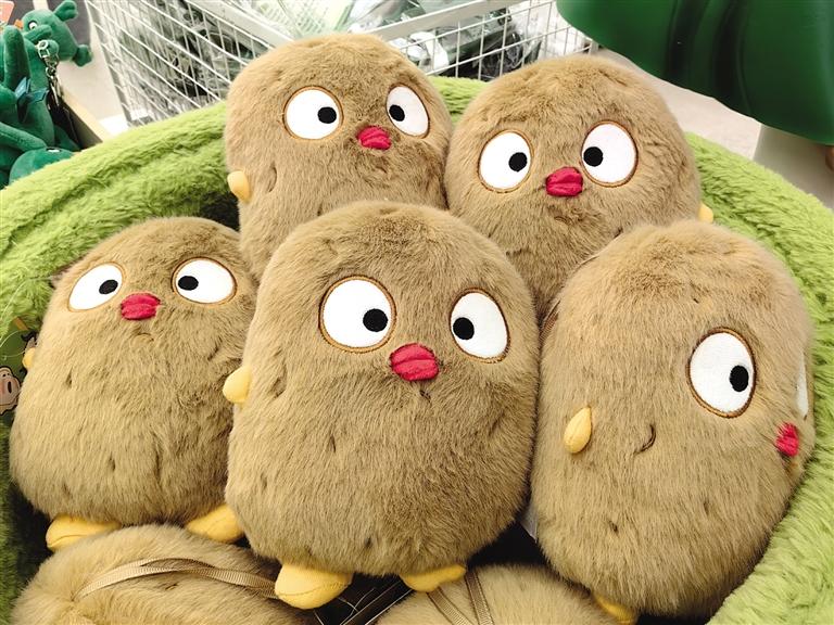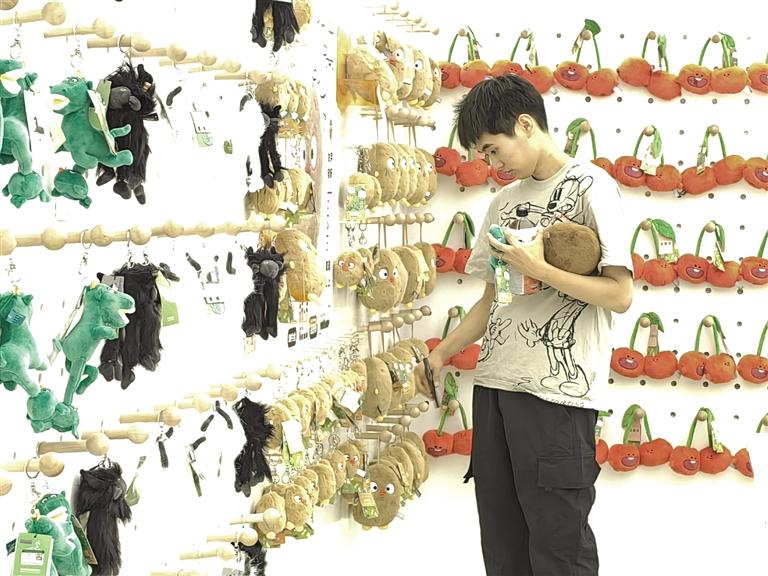 此時,目不暇接的花式文創(chuàng)在店內(nèi)“爭奇斗艷”,爭當“顯眼包”,等待被主人帶回家。掀開店內(nèi)一只毛絨收納箱,一窩土豆子撲閃著大眼睛向你眨眼。都說轉角遇到愛,誰料,轉角處粉嘟嘟的“拿捏玩偶娃娃公仔”捏著一個小蓮花花苞在向你招手。一回頭,造型別致的文創(chuàng)飾品精美又時尚,一側的帆布包上印著“別卷我”。就連記者逛下來,都入手兩件文創(chuàng)。